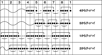 譜面の例を少し説明しますと、8拍のリズムサイクルがあり、1拍に4個の音が入っています。最初は、4拍目から「パパパパパン」が三回あって1拍目に着地するオーソドックスなティハイです。2つ目は同じ「パパパパン」の間を狭めてよりトリッキーさを与えています。3つ目は、「パパパパ、パパパパ、パン」という長さのオーソドックスなティハイ。4つ目は、また間を狭めてトリッキーにしています。